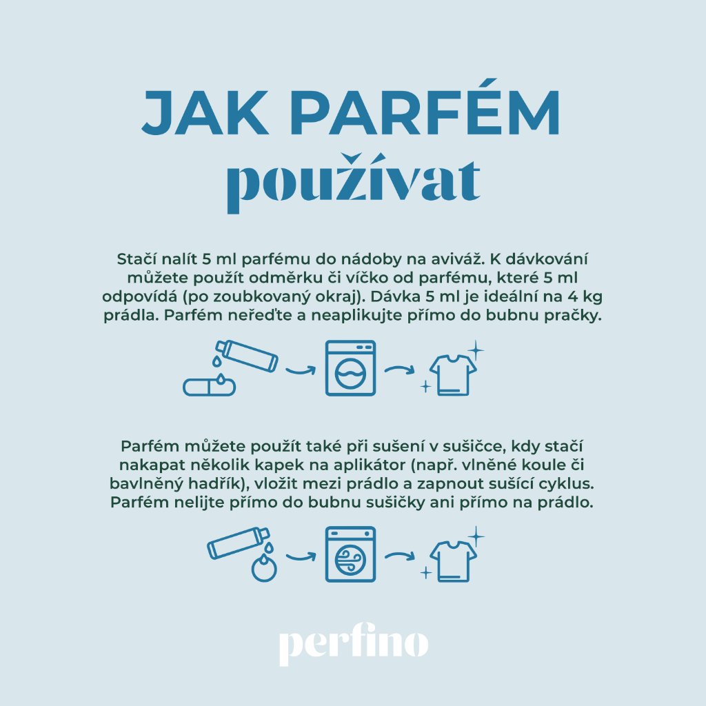 Na rozdíl od aviváže nezatěžuje vlákna ani nezanechává zbytky. Parfém na praní je šetrný, koncentrovaný a stačí ho jen pár kapek. Provoní prádlo na dny, někdy i týdny dopředu.
