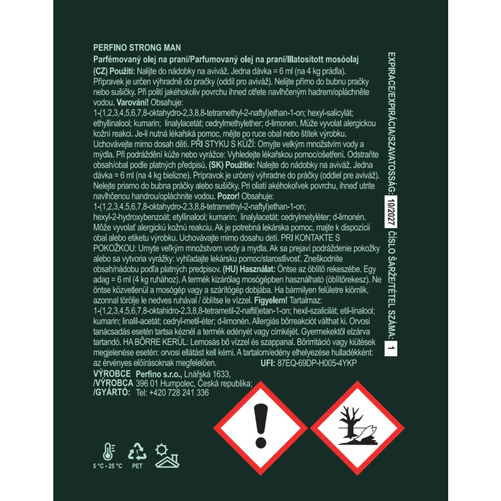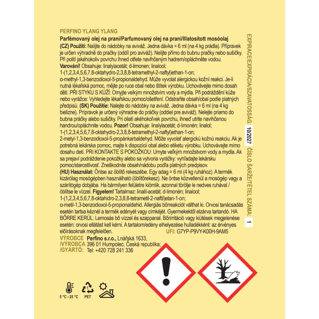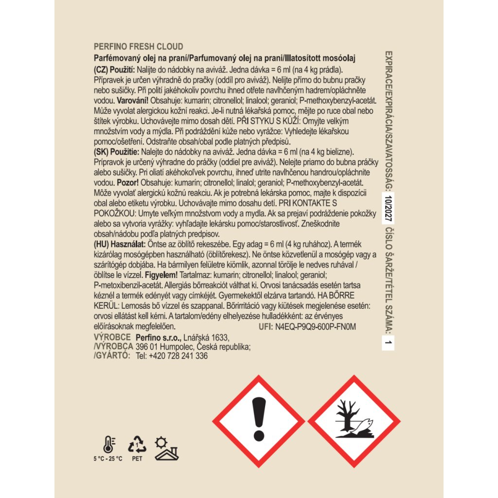 Stačí 5 ml (jedno plné víčko) nalít do přihrádky na aviváž. Parfém se během praní rovnoměrně rozprostře a provoní prádlo.